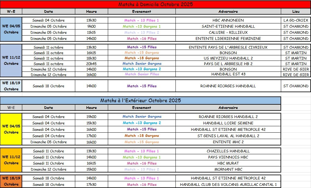 Matchs du mois d'Octobre